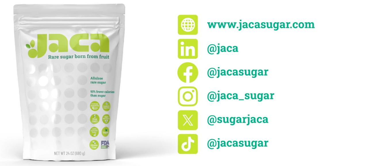 Jaca: Tastes, cooks and bakes like conventional sugar, is Diabetic & Keto friendly, has Zero net Carbs / Zero Glycemic index, has 90% less calories than sugar, has FDA GRAS status, is NON GMO, is FODMAP friendly (doesn’t cause IBS), is Kosher & Halal Certified, is Vegan, does not promote tooth decay, is Gluten Free Certified, reduces appetite (Clinical Trial data), promotes weight loss (Clinical Trial data), inhibits fat absorption by the body (Clinical Trial data), reduces body fat (Clinical Trial data), and has NO aftertaste.