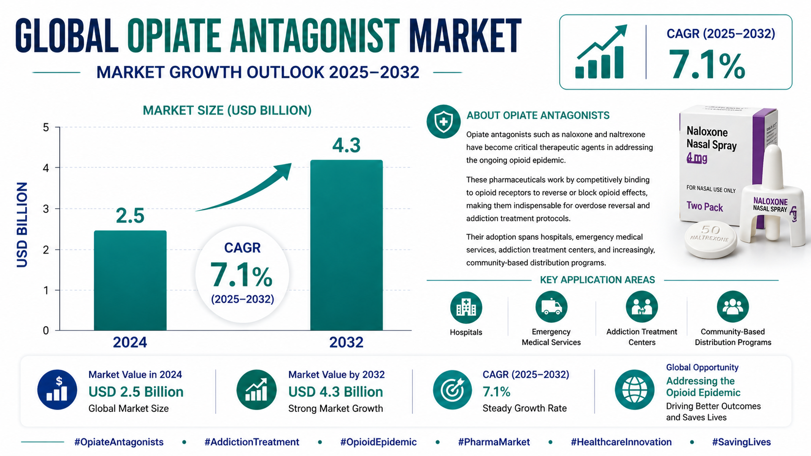 According to a newly published market research report by 24LifeSciences, the global opiate antagonist market was valued at USD 2.5 billion in 2024 and is projected to reach USD 4.3 billion by 2032, growing at a compound annual growth rate (CAGR) of 7.1% during the forecast period 20252032.