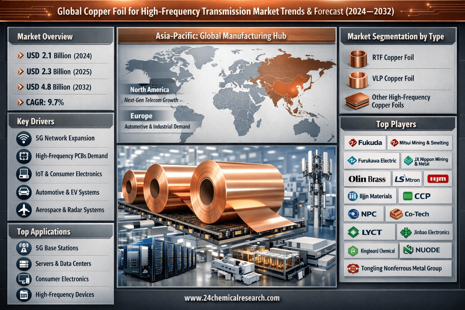 According to 24Chemical Research, Global copper foil for high-frequency transmission market size was valued at USD 2.1 billion in 2024. The market is projected to grow from USD 2.3 billion in 2025 to USD 4.8 billion by 2032, exhibiting a CAGR of 9.7% during the forecast period.