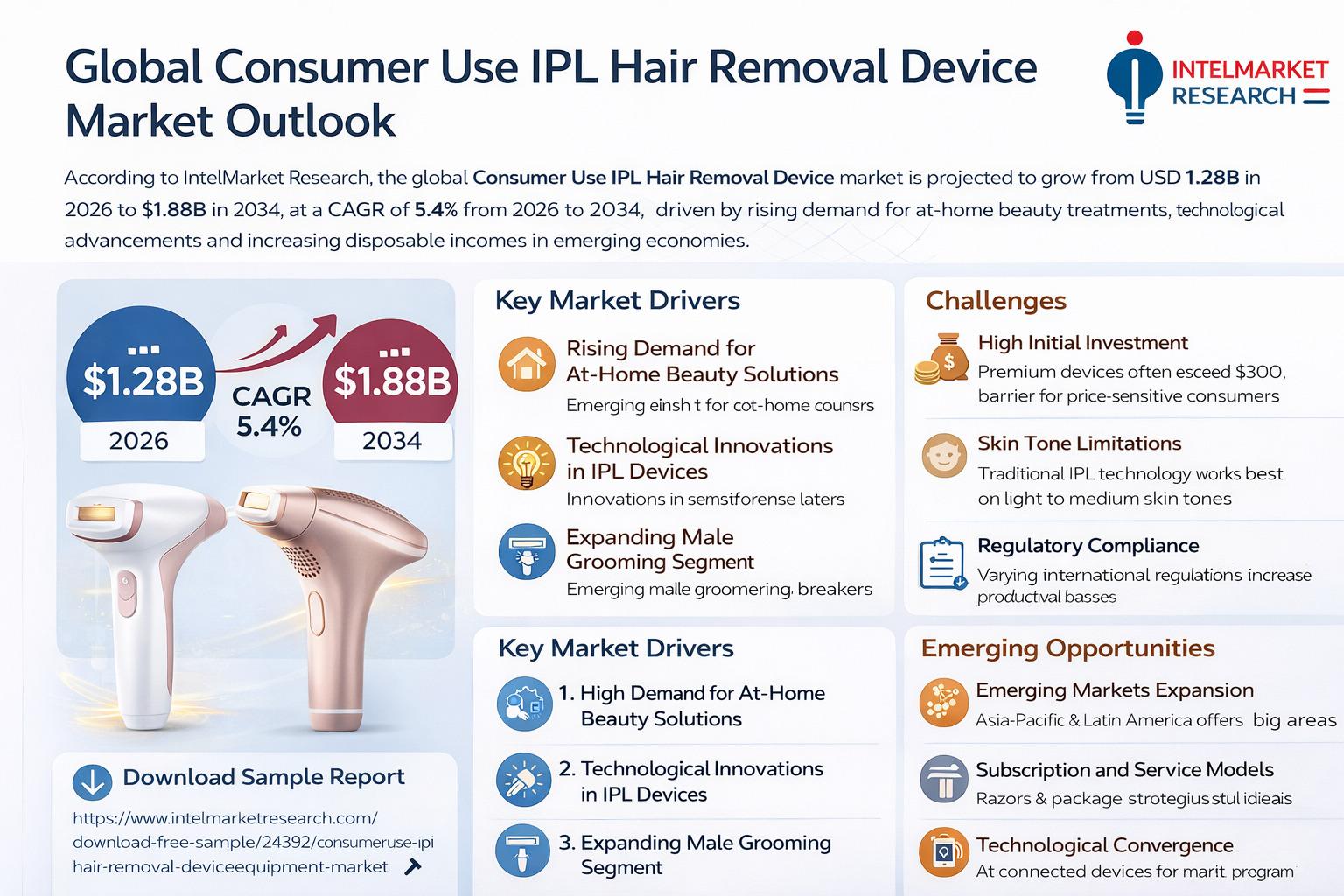According to a new report from Intel Market Research, Global Consumer Use IPL (Intense Pulsed Light) Hair Removal Device and Equipment market was valued at USD 1.28 billion in 2025 and is projected to reach USD 1.88 billion by 2034, growing at a CAGR of 5.4% during the forecast period (2026-2034). This growth is fueled by increasing consumer preference for at-home beauty treatments, technological advancements in IPL devices, and rising disposable incomes in emerging economies.