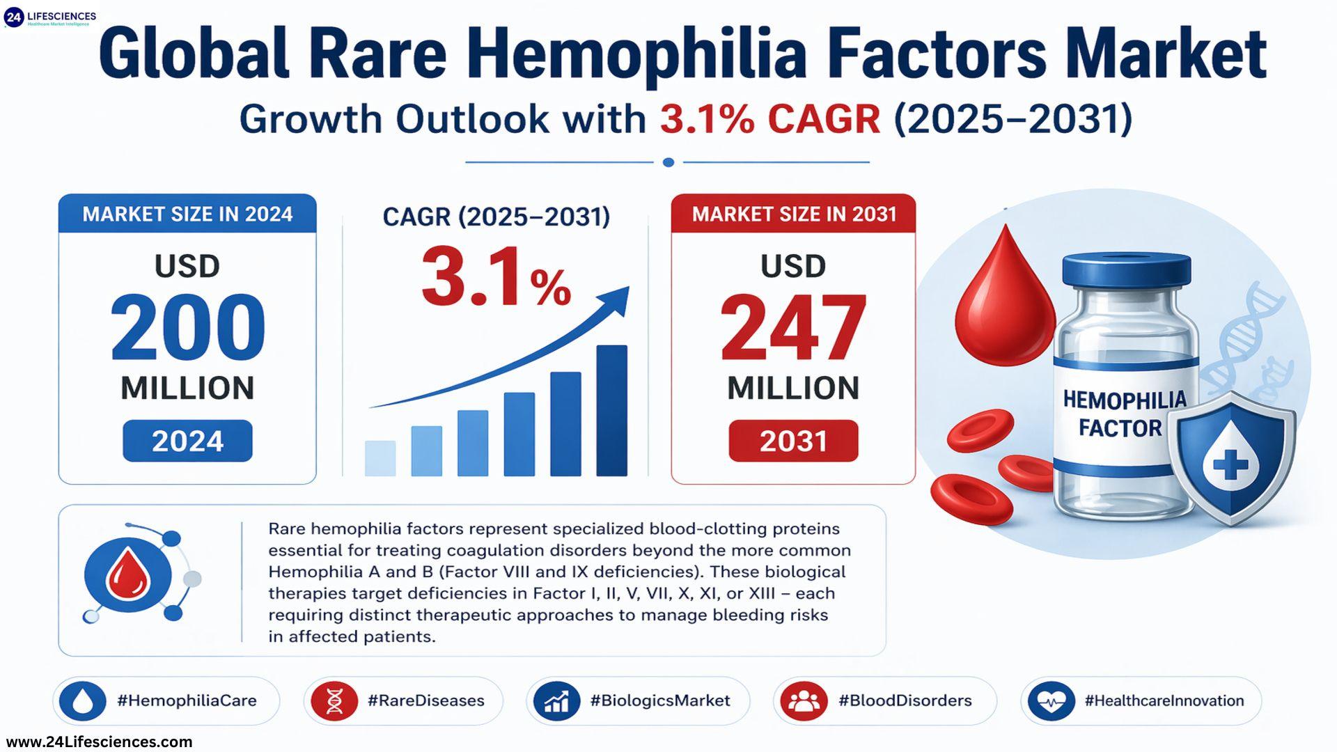 According to a newly published market research report by 24LifeSciences, global rare hemophilia factors market was valued at USD 200 million in 2024 and is projected to reach USD 247 million by 2031, growing at a compound annual growth rate (CAGR) of 3.1% during the forecast period 2025-2031.