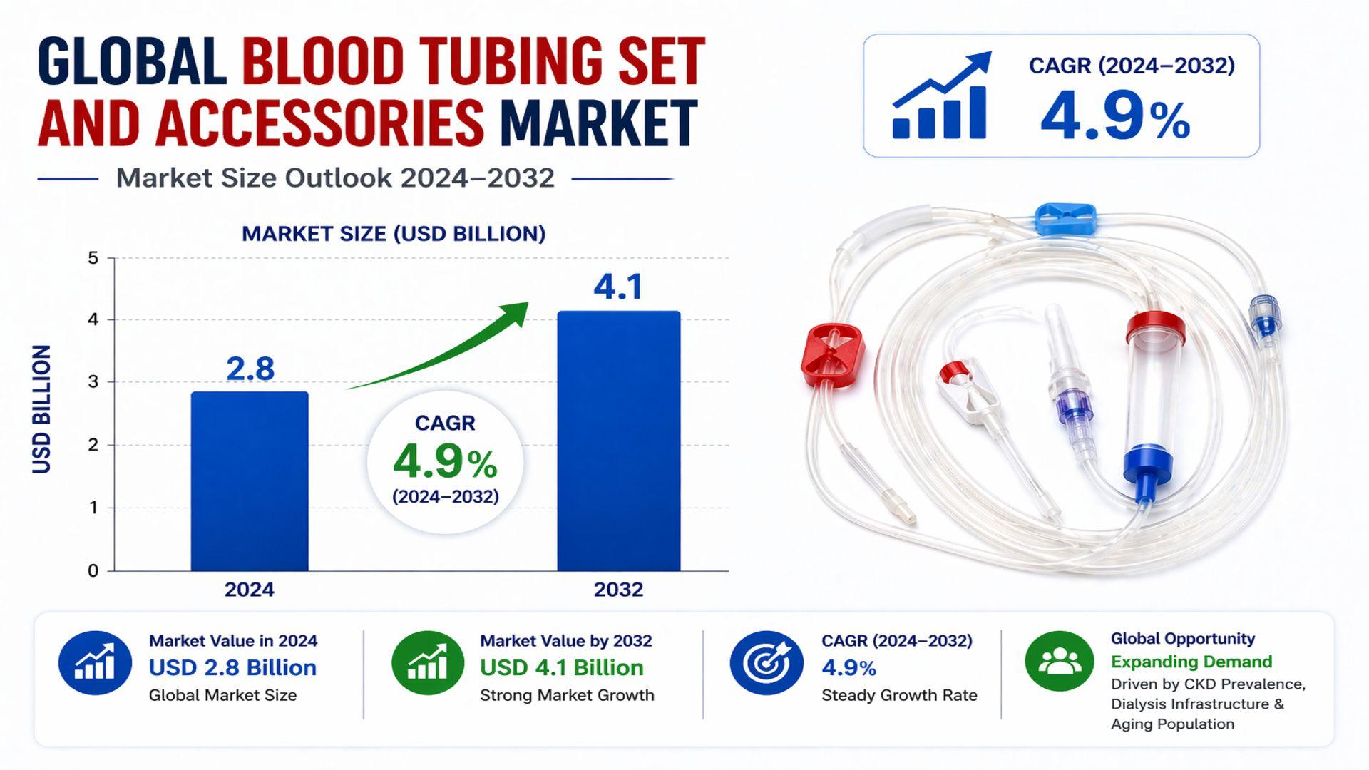Blood Tubing Set and Accessories market was valued at USD 2.8 billion in 2024 and is projected to reach USD 4.1 billion by 2032, growing at a CAGR of 4.9% during the forecast period. The market is a crucial segment of healthcare and life sciences, enabling safe and efficient hemodialysis, apheresis, and other extracorporeal therapies. Rising prevalence of chronic kidney disease (CKD), expanding dialysis infrastructure, and increasing geriatric populations are primary drivers fueling consistent market growth globally.