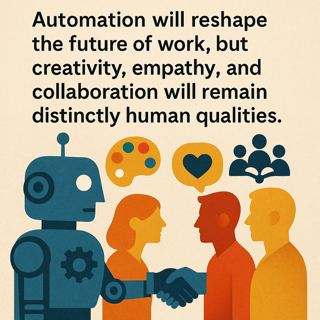 Automation is transforming industries and redefining how we work — from smart algorithms to robotic systems. Yet, in this digital revolution, the heart of humanity remains irreplaceable . Creativity fuels innovation , empathy builds meaningful connections , and collaboration drives progress . As machines take over tasks, let’s nurture the human touch that technology can never replicate.