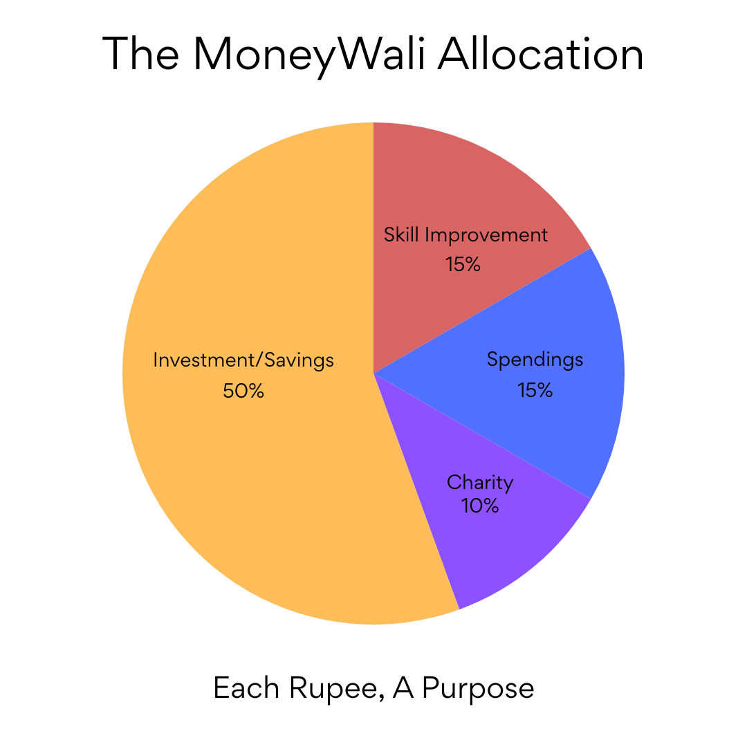 The MoneyWali Allocation A structured spending framework designed to balance growth, contribution, and enjoyment. Clear percentages allocated across charity, fun, skills, emergency, and investments—keeping discipline today to build independence tomorrow. 'Each Rupee, A Role'.