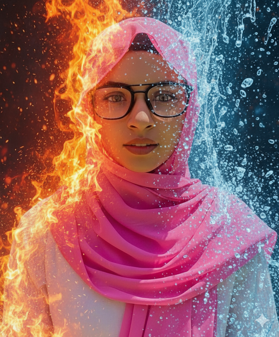 "Use the uploaded face reference. Keep the same identity, hijab, and glasses exactly as in the reference image. A hyper-realistic cinematic portrait of a fierce girl standing amidst a dramatic elemental clash of fire and water. The left side of her face is engulfed in vibrant, glowing flames with fiery orange sparks, while the right side is drenched in cascading icy blue water, frozen droplets suspended in motion. Her intense gaze pierces through the chaos. Hijab must fully cover all hair — no strands visible. Keep hijab neat, modest, and fully covering head and neck. Lighting must be dynamic and ultra-detailed, with contrasting warm and cool tones. Perfect symmetry of fire and water. High-resolution, 8K, cinematic style, volumetric lighting, dramatic atmosphere, realistic skin textures, photo-realism."
