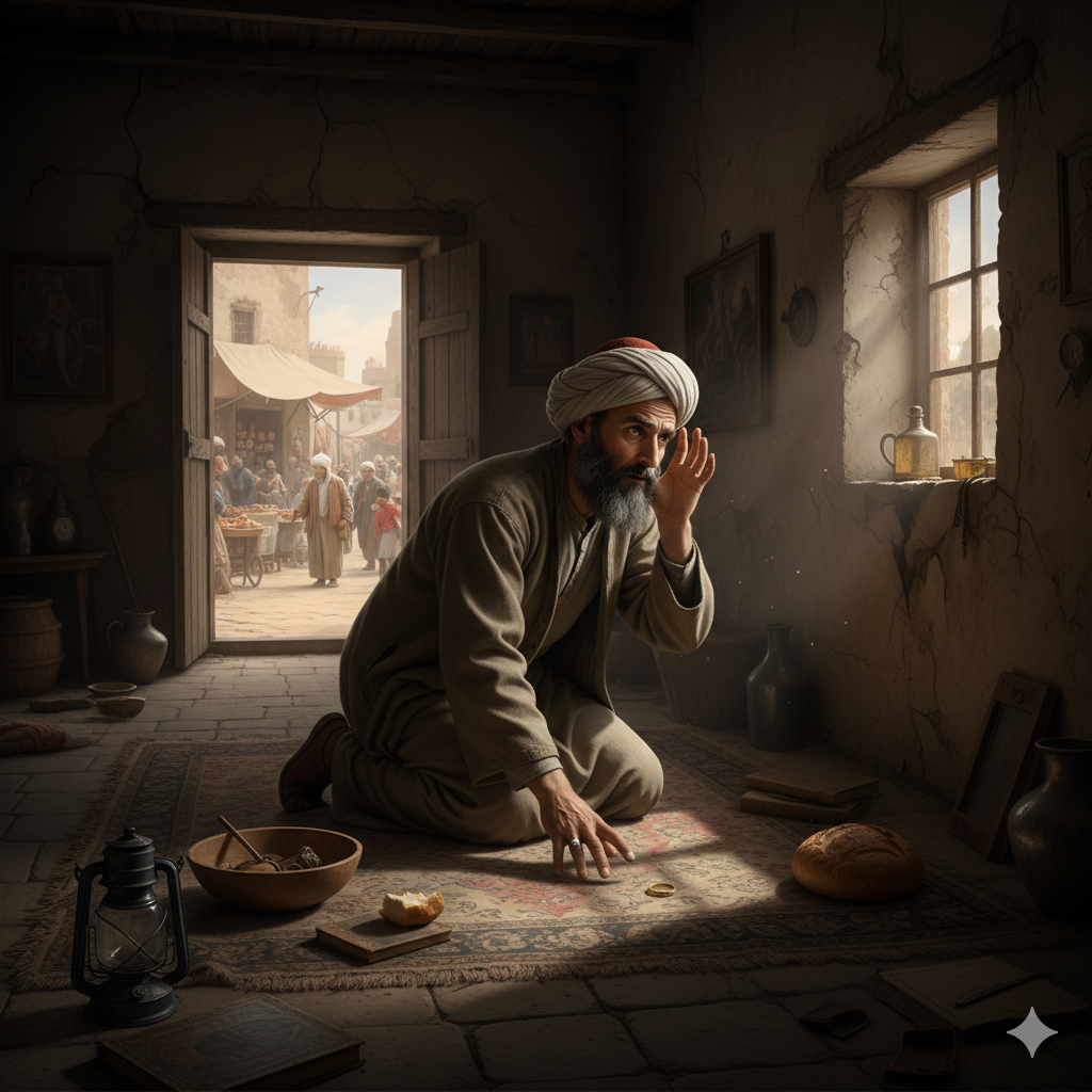 One afternoon, Mulla Nasrudin was walking through the busy marketplace when he suddenly realized his precious ring was missing. It was a silver ring with a bright stone, and it meant a lot to him. He began searching on the ground under a street lamp. Soon, a few townspeople gathered around to help him look.