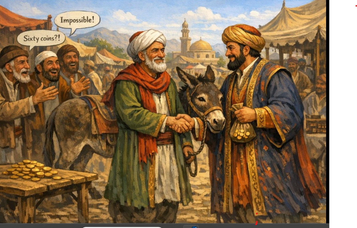 Mulla Nasrudin decided one morning to sell his donkey at the village market. He believed the donkey was worth fifty gold coins. It had carried him faithfully for years, and though it was not young, it was strong and dependable. Feeling confident, Nasrudin set off down the dusty road.