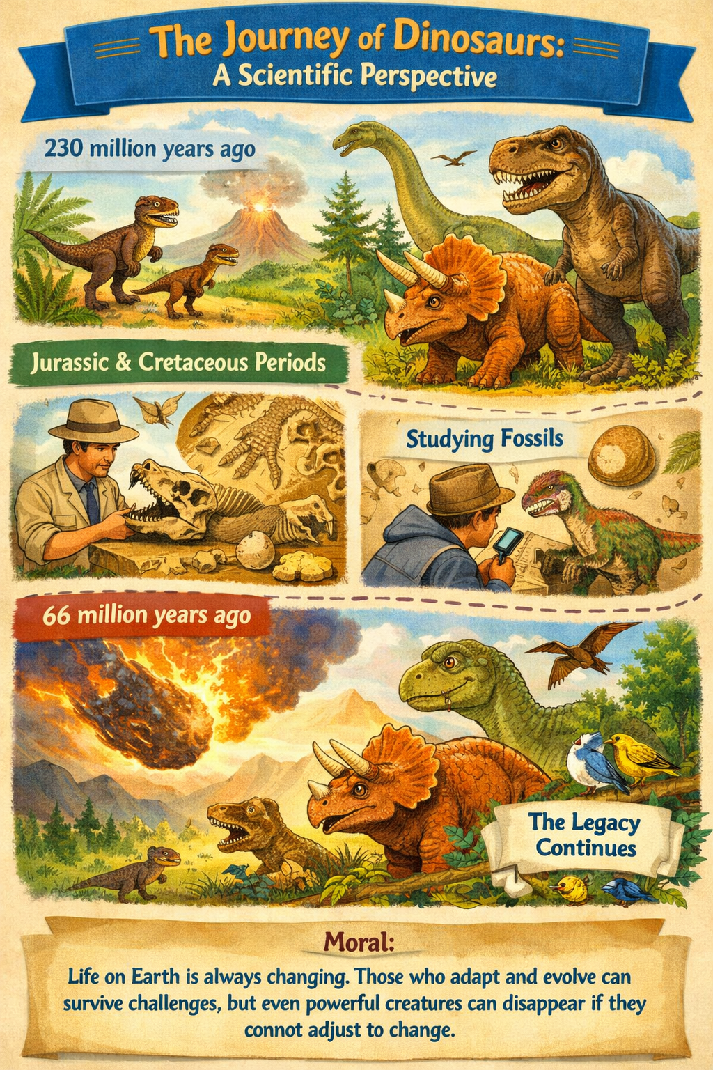 About 66 million years ago, a massive asteroid impact and major environmental changes led to the extinction of most dinosaurs. However, their story did not truly end, as birds continue their legacy today. The journey of dinosaurs teaches us about survival, change, and the history of life on Earth.