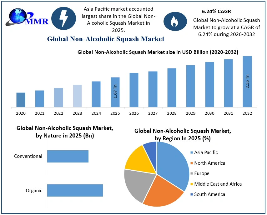 The global Non-Alcoholic Squash Market is witnessing significant growth as consumers increasingly shift toward healthier beverage alternatives that offer refreshing flavors and nutritional value. According to recent industry analysis, the market was valued at USD 1.67 trillion in 2025 and is projected to grow at a compound annual growth rate (CAGR) of 6.24% from 2025 to 2032, reaching nearly USD 2.55 trillion by 2032. The rising focus on health, growing demand for natural ingredients, and expanding availability of fruit-based beverages are expected to drive substantial market expansion during the forecast period.