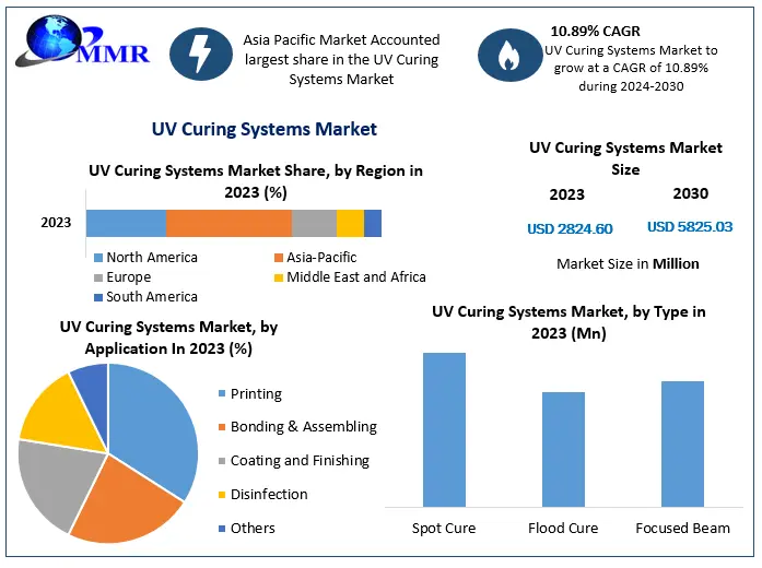 • The global UV Curing Systems Market is witnessing remarkable growth due to the rising demand for efficient, eco-friendly, and high-performance curing technologies across multiple industries. According to the latest market research analysis, the market was valued at USD 2,824.60 million in 2023 and is projected to reach USD 5,825.03 million by 2030, expanding at a compound annual growth rate (CAGR) of 10.19% during the forecast period (2024–2030). The increasing adoption of UV curing technology in printing, coating, electronics manufacturing, and medical devices is driving the market forward.